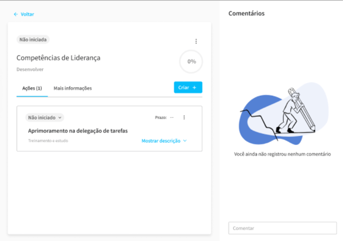 A ideia é ajudar a liderança a retomar planos já criados, evitar que ações fiquem esquecidas e aprofundar conversas de desenvolvimento de forma contextual.