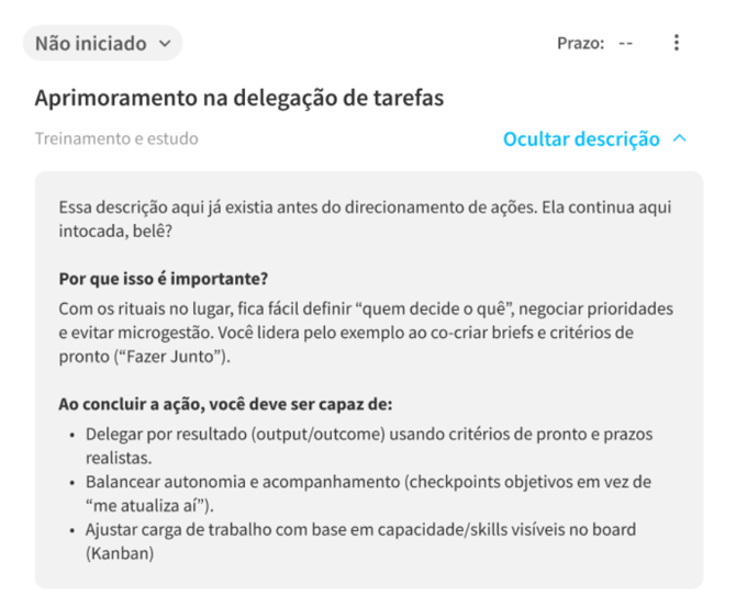 Ao criar um novo PDI com apoio da IA, os textos de “por que isso é importante” e “o que você será capaz de fazer” são gerados automaticamente nas ações. -