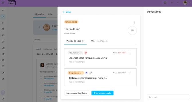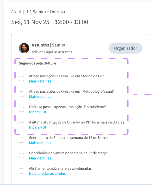 Na marcação de 1:1, o sistema analisa os dados dos PDIs ativos do colaborador e sugere temas quando identifica: