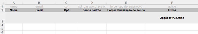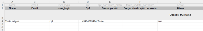 As colunas a serem apresentadas não estão de forma padrão no modelo básico ou completo de importação, elas precisam ser criadas conforme o print abaixo. O preenchimento permite gerar automaticamente senhas padronizadas baseadas no CPF do colaborador:
