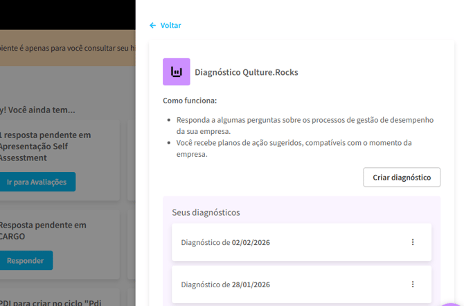 Ao acessá-lo, é aberto na própria aba uma janela com informações sobre o diagnóstico da empresa onde é possível tanto: Criar um novo Diagnóstico ou acessar o histórico de diagnósticos da empresa.