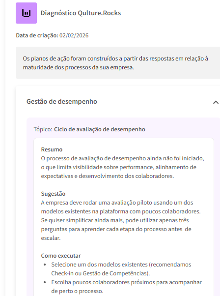 Ao finalizar o Diagnóstico, o Admin receberá uma análise de cada tópico avaliado, ponto a ponto com Resumo, Sugestão e Como executar.