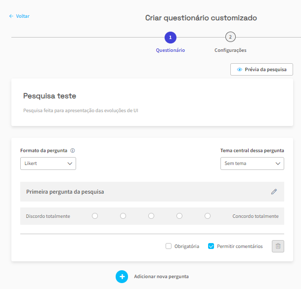 Além disso, é possível selecionar se a pergunta será respondida por escala de notas Likert, eNPS, ou por campo de comentário somente: