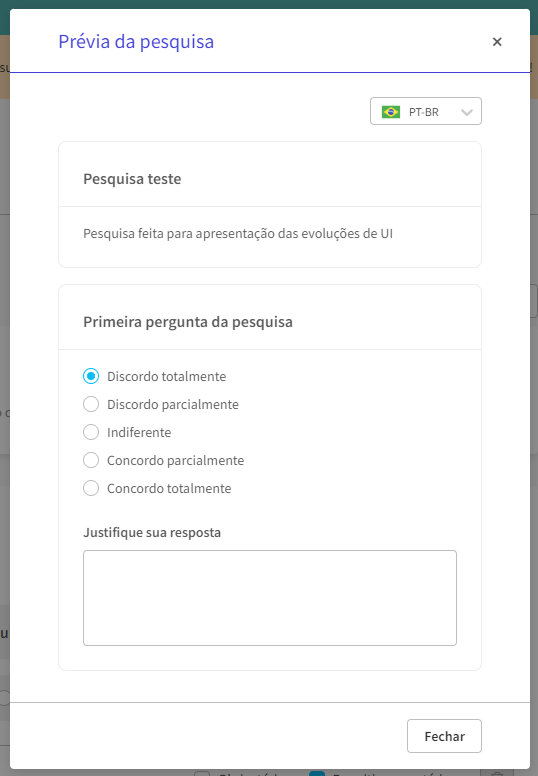 Após a criação do formulário, você já poderá ter uma prévia de como ficará sua pesquisa no momento de resposta dos seus colaboradores, basta ir em "Prévia da pesquisa".