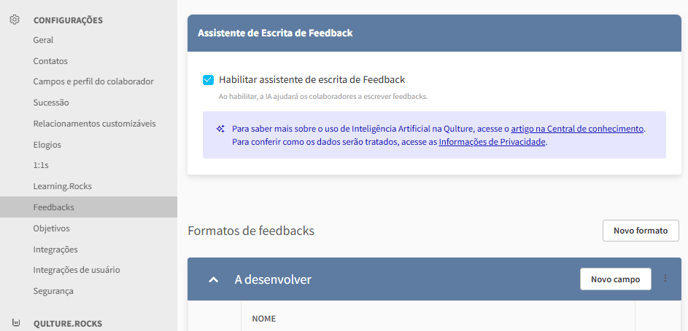 Para que o recurso esteja disponível, o administrador da empresa deve ativá-lo nas configurações da organização, na aba Feedback.