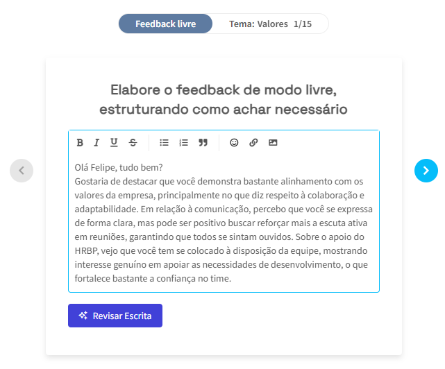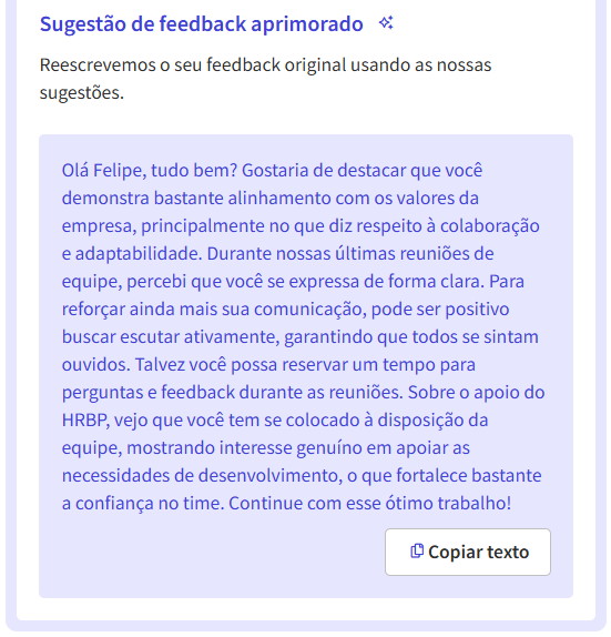 O assistente de IA no módulo de Feedback tem como objetivo facilitar a escrita de feedbacks, ajudando você a se expressar com mais clareza e confiança.