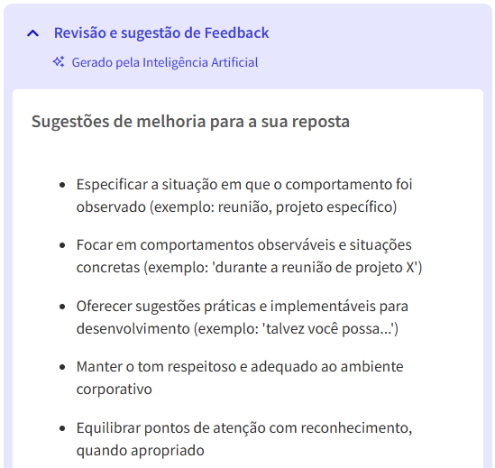 Para gerar as sugestões de melhoria, a IA considera apenas as informações do próprio feedback que está sendo escrito.