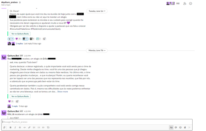 E usando o canal que foi escolhido no momento da integração, ele passará a funcionar como um mural de elogio.