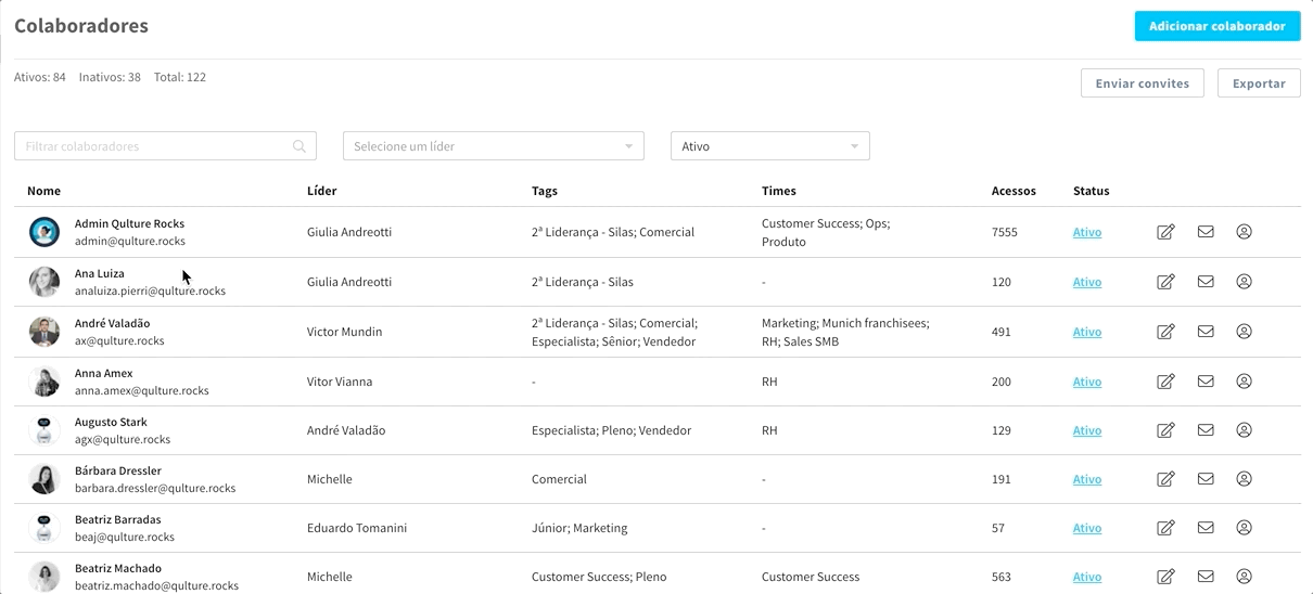 ✅ Acompanhar: visualizar estatísticas sobre as respostas de forma geral, e detalhadamente por avaliador e por avaliado; enviar convites e lembretes para participar da avaliação; extrair o relatório de acompanhamento.