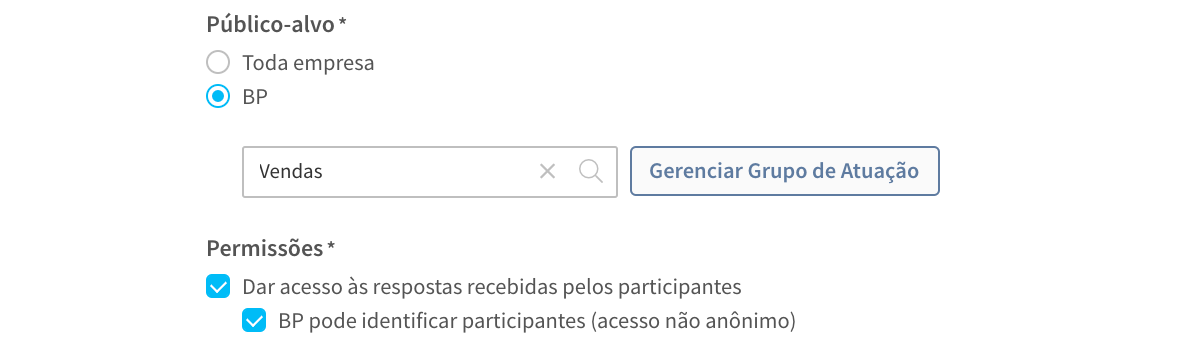 Na mesma linha de raciocínio, é possível definir o público alvo como "Toda a empresa" ou como "BP". Também é possível definir as permissões desse perfil, sendo possível: