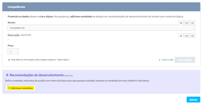 🟣 Ao clicar em 'criar tópico', a mágica acontece, e a opção de Recomendação de Desenvolvimento é habilitada automaticamente.
