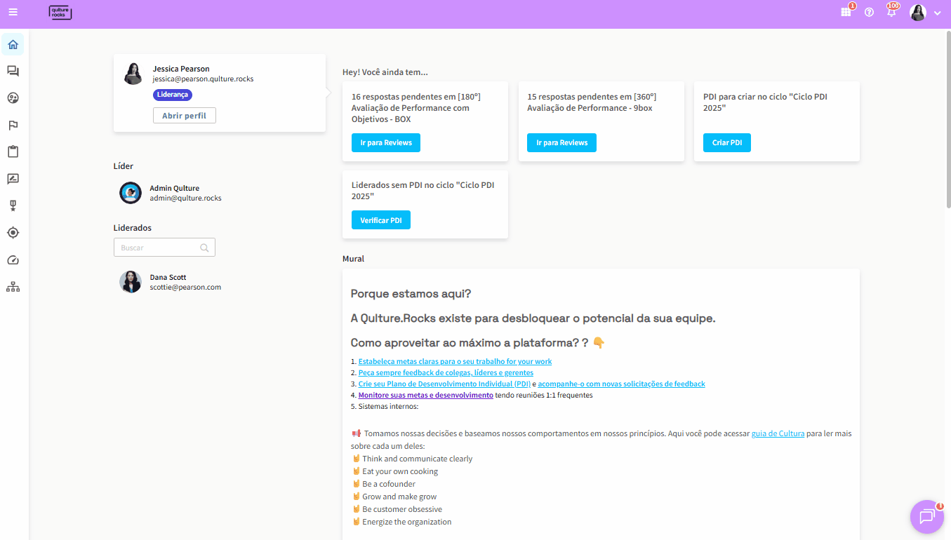 O que um líder visualiza no perfil dos colaboradores ao navegar na hierarquia (GIF abaixo) é um agregado de todas as informações anteriores. Isso significa que ele poderá ver no perfil apenas as funcionalidades habilitadas individualmente, além de dados básicos como nome, e-mail, nome do líder, times aos quais o colaborador pertence e a lista de seus liderados.