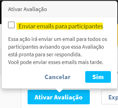 No momento de ativar a avaliação é possível selecionar a opção de enviar emails para os participantes, avisando que ela já está pronta para ser respondida: