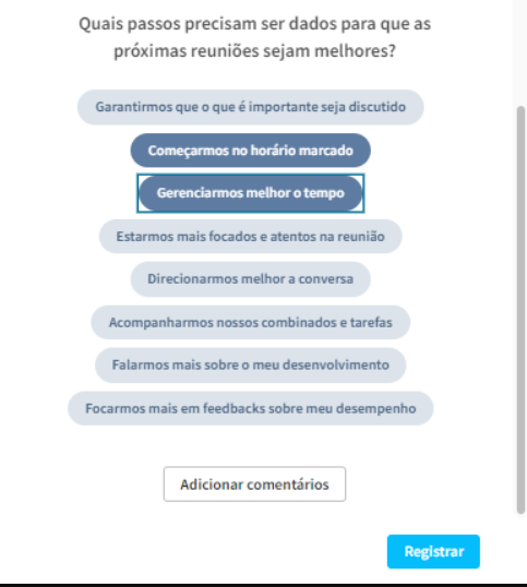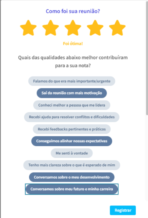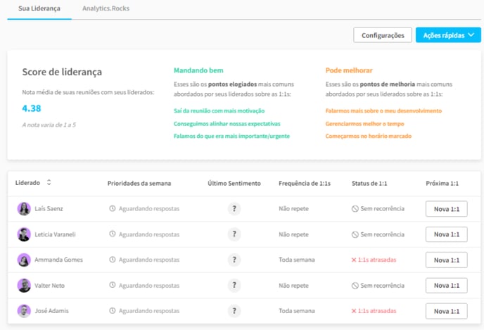 Ter acesso a sua nota de liderança e aos pontos positivos e de desenvolvimento das suas 1:1s;