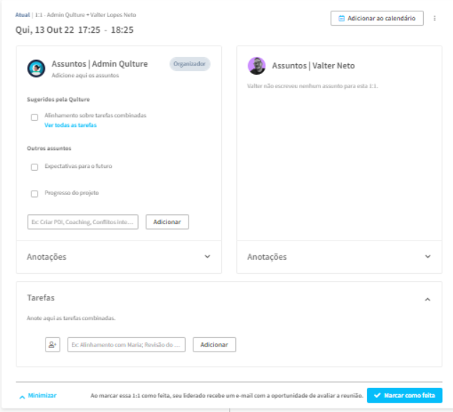 Por último, é necessário clicar no botão “Marcar como feita” pois caso contrário, o plataforma entenderá que a reunião ainda não ocorreu e será informada como atrasada.