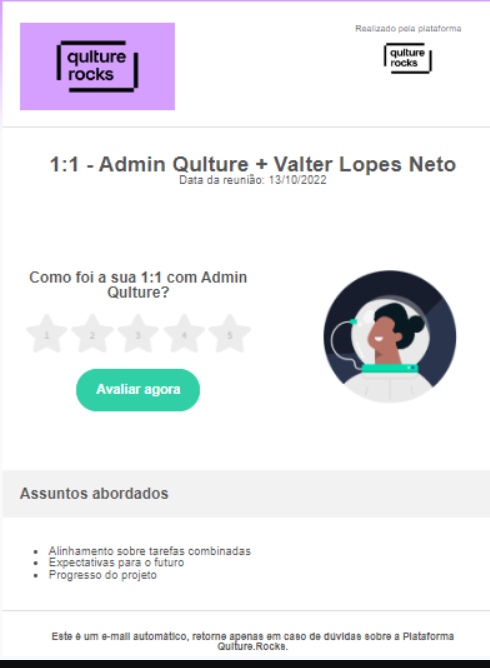 Por último, um e-mail sobre as prioridades da semana é enviado toda segunda-feira para os liderados, convidando-os a preencher às suas 5 principais prioridades de entrega para aquela semana em questão.