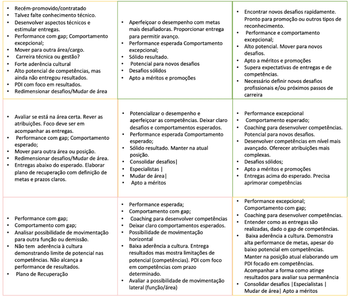Importante: Lembrando que cada cliente coloca nos eixos do box as variáveis que mais fazem sentido para sua avaliação (temos alguns exemplos neste artigo aqui), portanto as descrições também podem (e devem) variar! Você vai ver que as descrições apresentadas aqui fazem sentido para as variáveis Comportamento/Fit Cultural X Resultado ou Comportamento/Fit Cultural X Potencial.