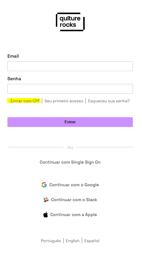 ⚠️ Importante: é necessário fazer o download do aplicativo Qulture.Rocks e Google Chrome pela Play Store (Android) ou App Store (iOS) para fazer Login pelo Google ou Slack ou SSO.