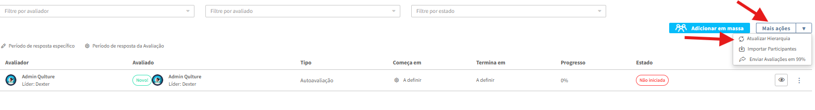 Vá até o filtro de avaliador ou avaliado e pesquise pelo colaborador que você alterou a hierarquia. Você pode observar que o liderado ainda está sendo avaliado pelo seu líder antigo. Da mesma forma, você pode ver que o novo líder não está avaliando o colaborador.