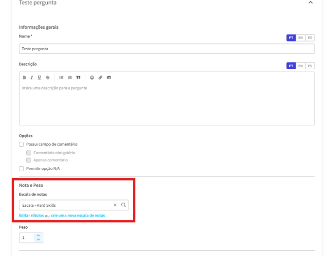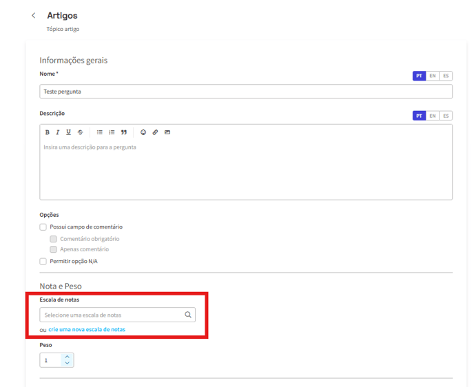 Aprenda como criar ou editar as opções de uma escala de notas em uma avaliação.