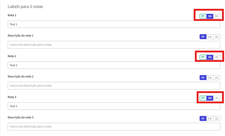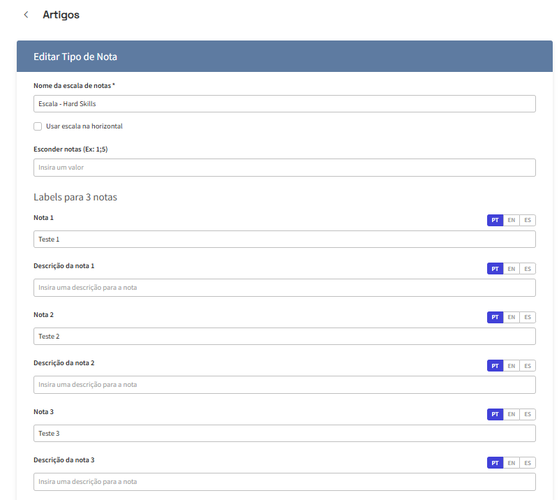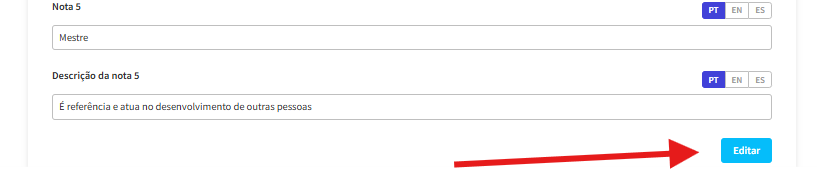 Caso haja algum colaborador que queira visualizar a escala de notas em um idioma diferente do padronizado, é necessário preencher manualmente o espaço reservado à língua desejada com a tradução correta.