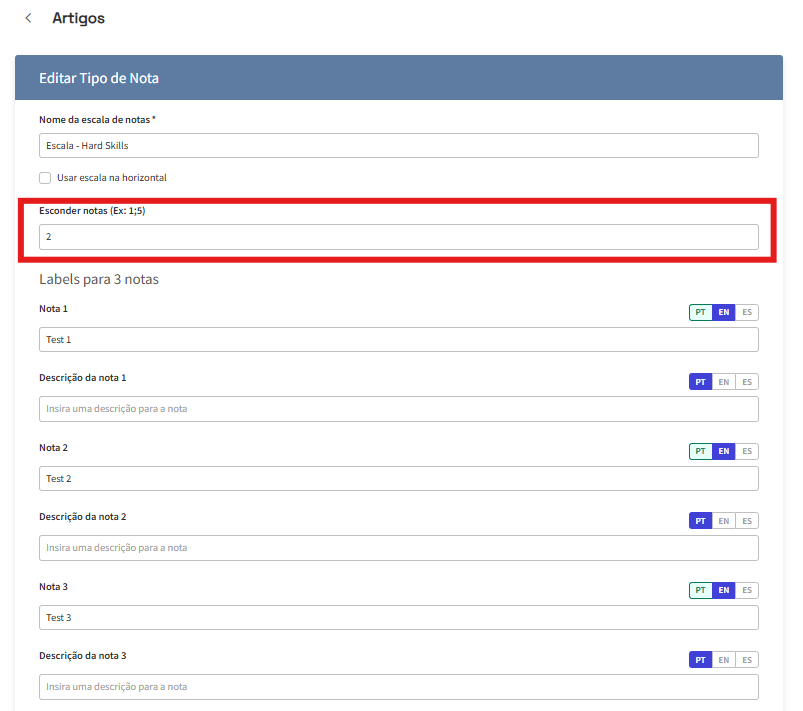 1. Em criar ou editar uma escala de notas, escreva os números das notas que deseja esconder no campo "Esconder notas" como indicado na imagem:
