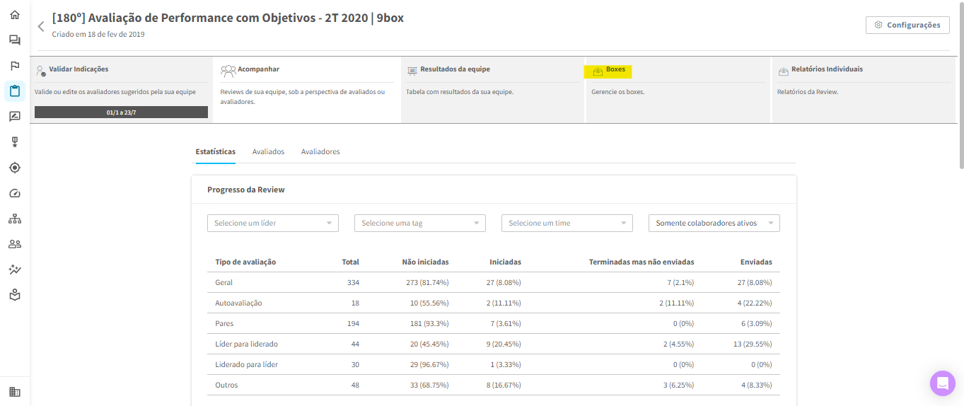 Como administrador da Plataforma você verá em sua tela principal do módulo de avaliações uma opção chamada "Boxes". Selecione-a: