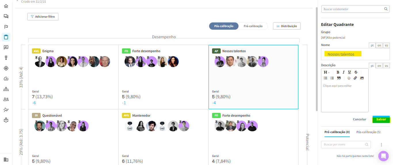 No canto direito da tela aparecerão agora as opções para edição do nome e descrição do Quadrante. Preencha-os com as informações desejadas e selecione o botão de "Salvar".