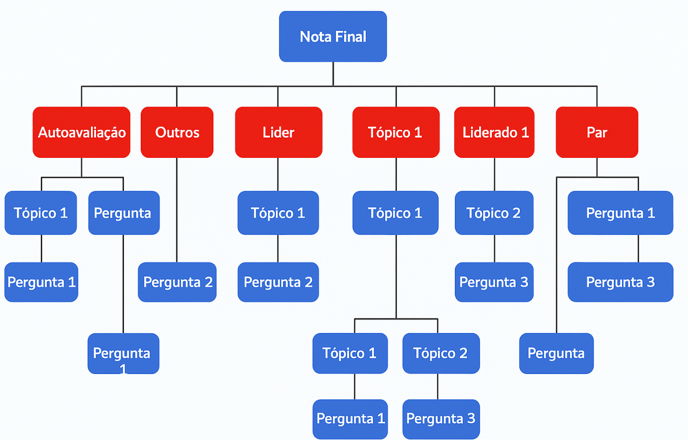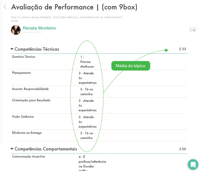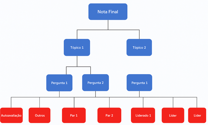 É importante entender que a plataforma trabalha em camadas: primeiro calcula a média das perguntas em que a pessoa foi avaliada, depois a média do tópico e, por fim, a média geral.