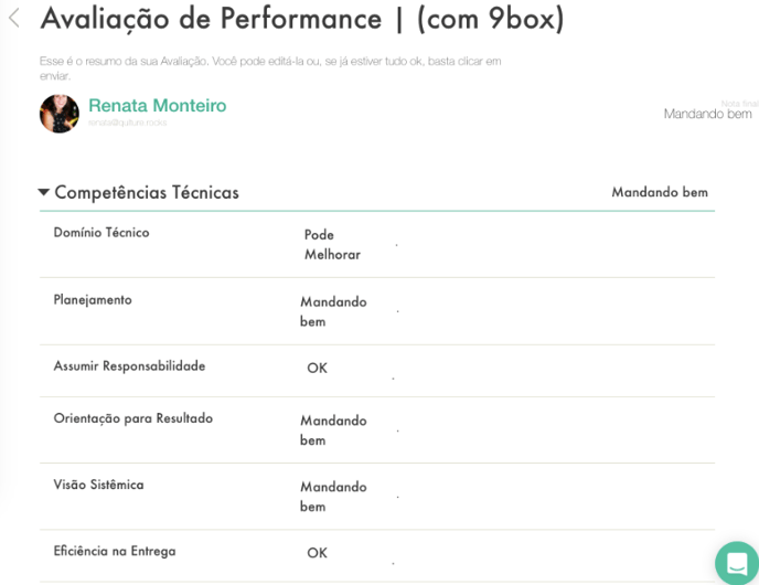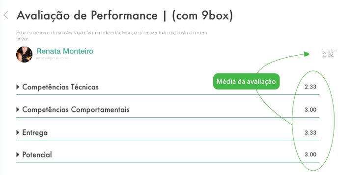 Na última tela do formulário de avaliação, é exibido um resumo das respostas — com médias exibidas conforme as configurações da avaliação podendo ser: números ou escala de conceitos.