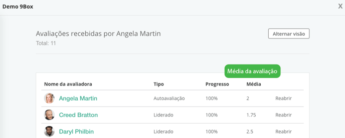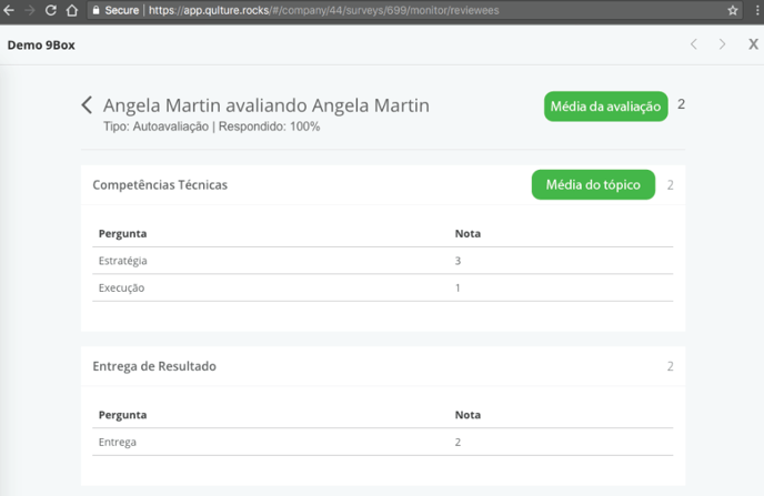 As médias também são exibidas ao clicar no nome do avaliado nas telas Acompanhar ou Resultados da Equipe. Se a avaliação estiver configurada para mostrar escalas de conceitos, elas serão exibidas aqui também.