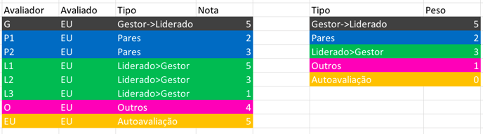 Tomemos a seguinte estrutura de avaliações, com a tabela abaixo e à direita indicando os pesos por relacionamento, configurados por um admin na criação da avaliação.Vamos entender como funcionam os dois tipos de cálculo de médias coletivas.