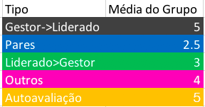 Note que o sistema trata todos os relacionamentos como grupo, mesmo havendo somente um participante (par avaliadora -> avaliada), como por exemplo autoavaliação.