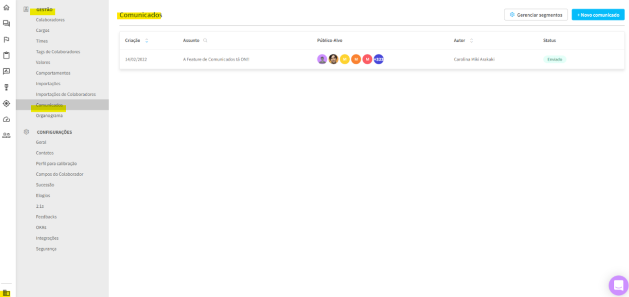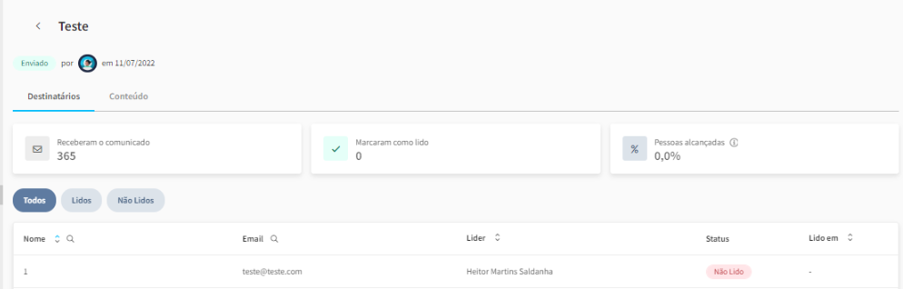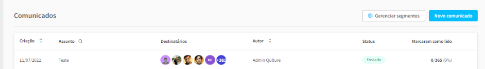 Para que os admins consigam gerenciar todas as comunicações enviadas na empresa é possível visualizar a tabela que contém 7 informações principais: