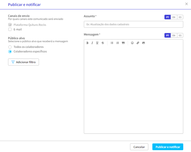 Com a nova ferramenta de Comunicados, é possível configurar as comunicações internas a serem enviadas para os colaboradores da empresa. Há opção de selecionar o público específico com filtros avançados ou disparar para todos os integrantes.