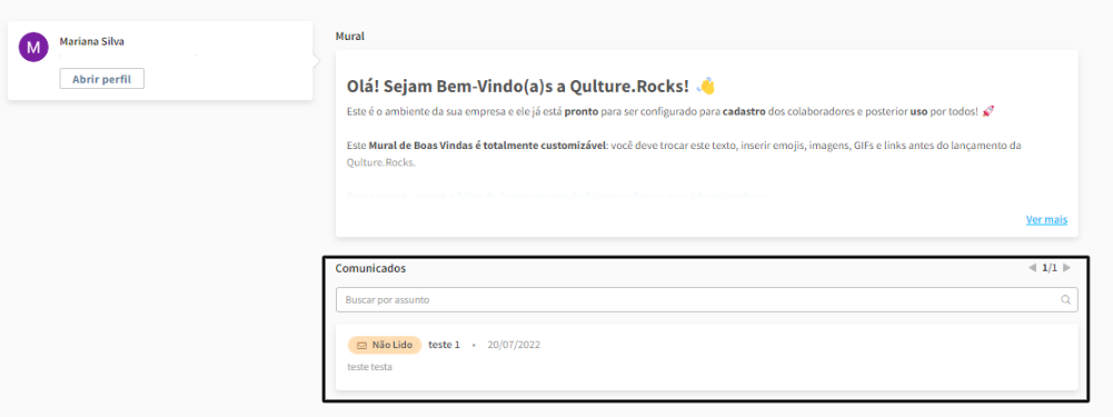 4. Todas as comunicações recebidas ficam disponíveis na seção 'Comunicados' da One Page. O colaborador consegue ver o status do comunicado lido/não lido