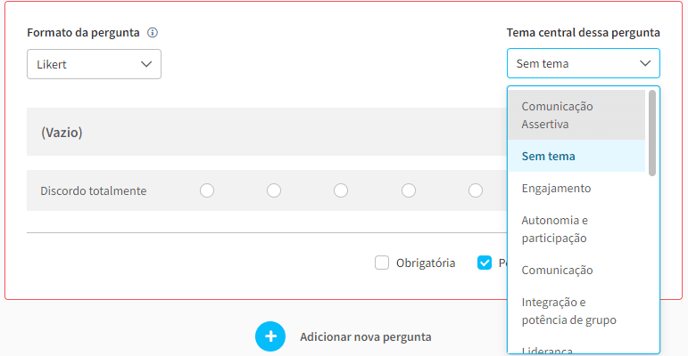 Os temas são filtros específicos que você pode utilizar para definir o assunto abordado por determinada pergunta ou grupo de perguntas. Ao atribuir temas às perguntas, facilita-se o processo de análise, pois as respostas podem ser categorizadas de acordo com os temas escolhidos.