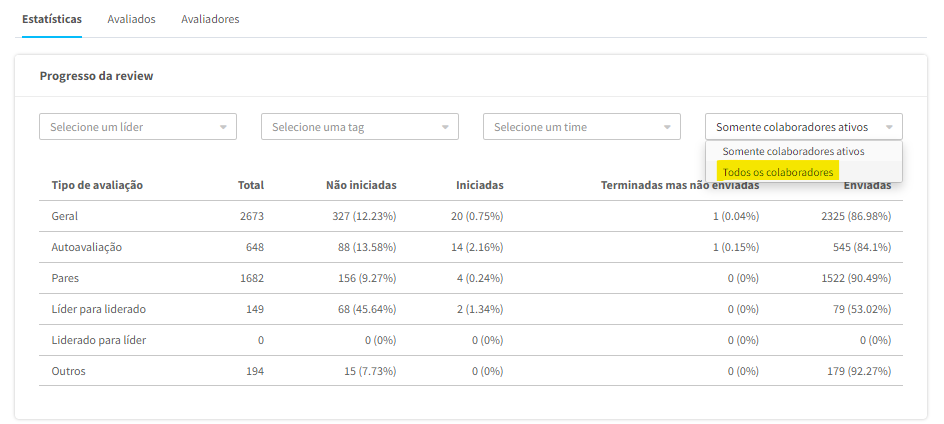 R: Para ter a visualização apenas dos colaboradores ativos no exporte de relatório de acompanhamento, é necessário filtrar nas colunas 'ativo' de avaliadores e de avaliados. E para ver na plataforma da mesma forma que o exporte é necessário mudar a visualização das estatísticas, como no print abaixo