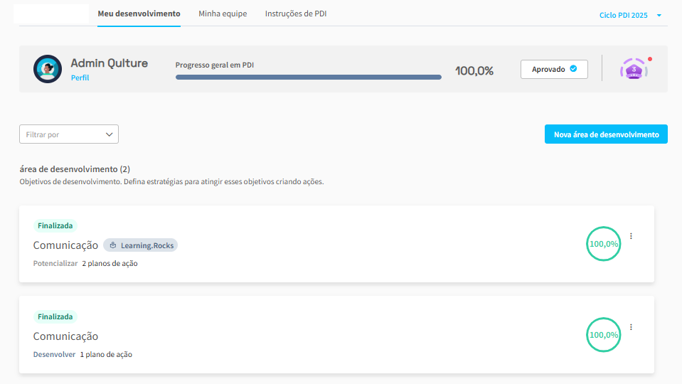 Além disso, como administrador, você terá a capacidade de aprovar o PDI de qualquer colaborador, garantindo que o processo de desenvolvimento individual seja adequadamente gerenciado e acompanhado.