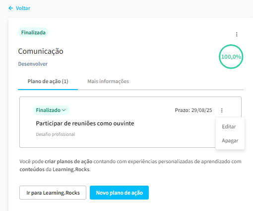 Ao clicar nas áreas já cadastradas na aba "Meu desenvolvimento", você terá a possibilidade de criar um novo plano de ação para a área selecionada. Além disso, você poderá editar informações como nome do plano, data de entrega e data de conclusão. Caso necessário, também será possível apagar o plano de ação, caso não seja mais relevante para o seu desenvolvimento.