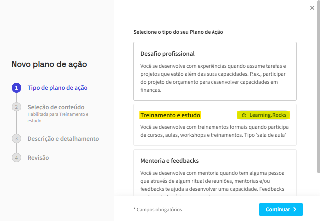 ⚠️ Importante: Caso a sua empresa tenha o produto de Learning.Rocks contratado, o cadastro do plano de ação aparece de forma diferente do padrão, já que possui a parte de "Treinamento e Estudo".