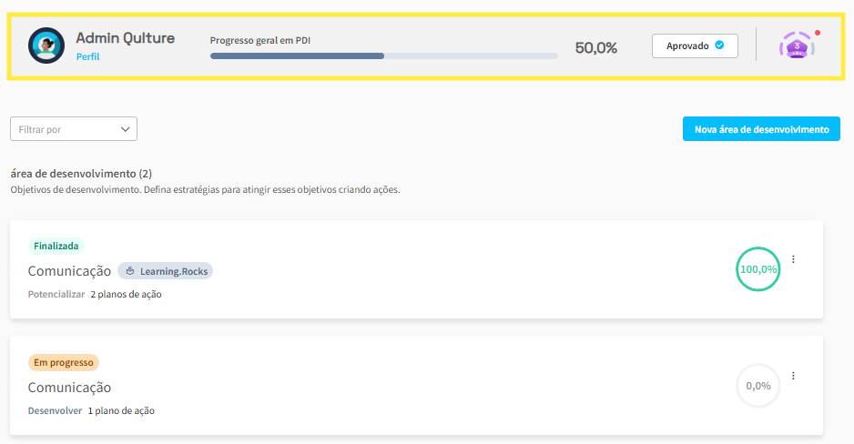 A cada plano de ação concluído, o status da área de desenvolvimento é automaticamente alterado, demonstrando o avanço que o colaborador teve. Esse progresso também é refletido no Progresso geral do PDI que vemos na aba ‘Meu desenvolvimento’. Dessa forma, é possível ter uma visão mais precisa de como o colaborador está caminhando em torno de seu plano de desenvolvimento.