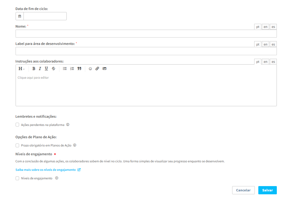 Escreva as instruções detalhadas que deseja comunicar aos colaboradores. Essas instruções podem abranger diversos aspectos, como o processo de criação de áreas de desenvolvimento, definição de metas, cadastro de planos de ação e qualquer outra orientação relevante para o PDI.