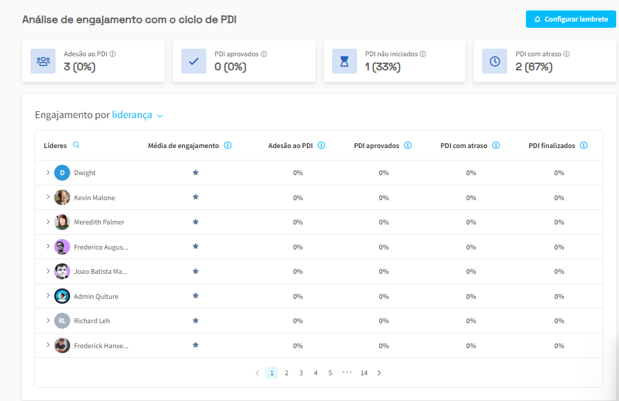 - Adesão ao PDI: A porcentagem de liderados diretos de um líder que criaram um PDI, em relação ao número total de liderados diretos desse líder.