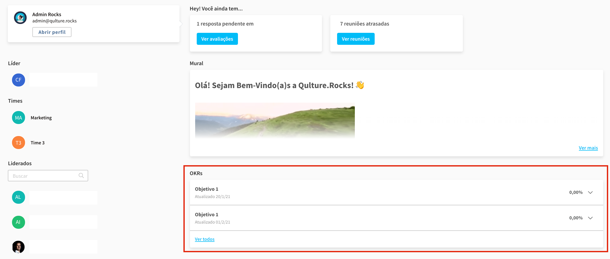 Essa configuração determina se a aba "Home" aparece ou não para os colaboradores, bem como a parte de OKRs na página inicial do perfil, conforme imagens abaixo: