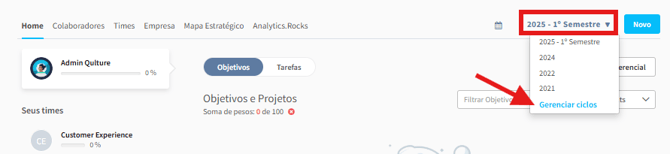 Caso você já possua algum ciclo de OKRs criado, no canto superior direito da página, você deve selecionar a opção Gerenciar ciclos;