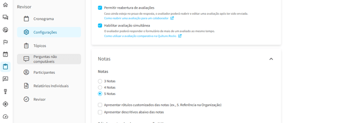 No exemplo apresentado, a configuração está definida para 5 notas. Isso significa que todas as escalas precisam obrigatoriamente ter a mesma quantidade de labels, ou seja, 5 labels cada.