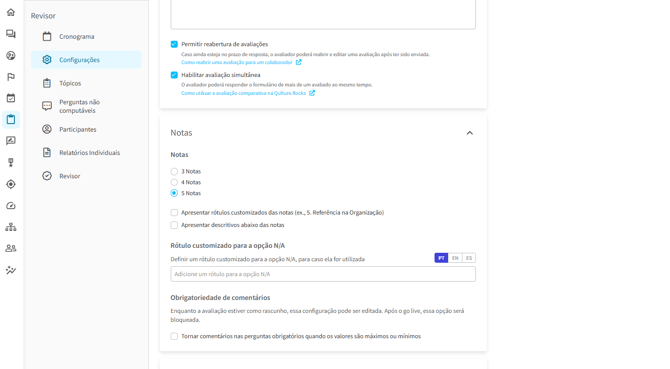 A partir do momento que uma avaliação tiver participantes, o revisor indicará duas questões importantes para o ciclo: