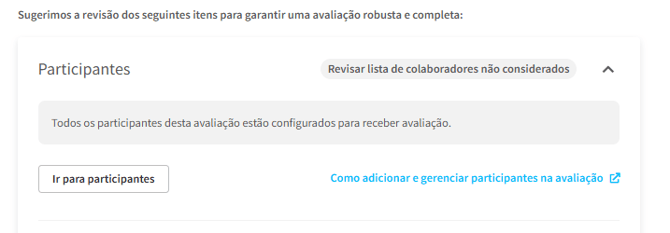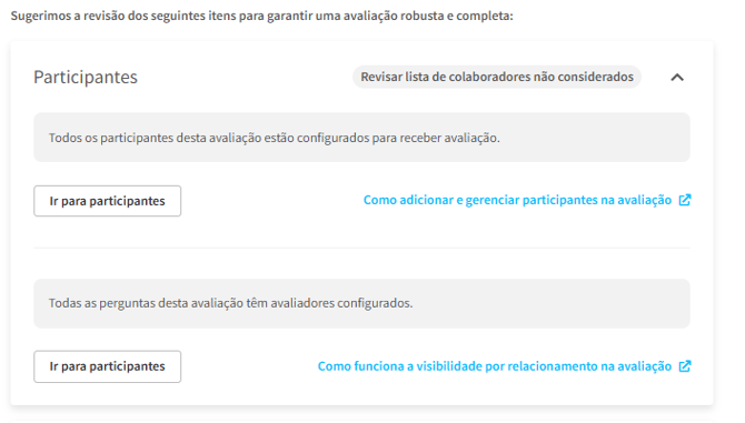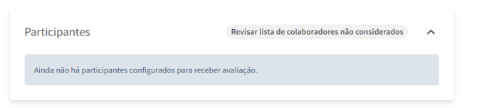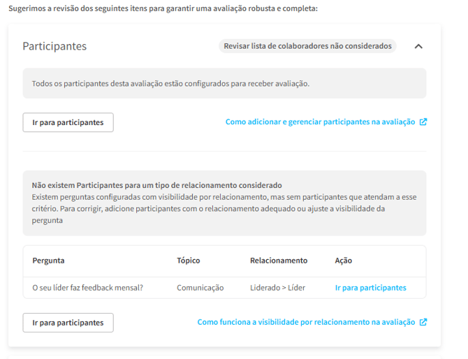 ❗Observação: Isto não é necessariamente um impedimento para o lançamento do ciclo. Um avaliador pode participar apenas como avaliador, por exemplo, por estar no topo da hierarquia. Trata-se apenas de uma sugestão, com o objetivo de garantir que todos tenham a oportunidade de serem avaliados dentro do ciclo.