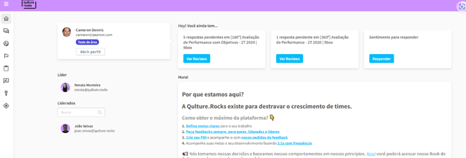1. Primeiro o líder deverá acessar a ferramenta de PDI, a qual fica ao lado esquerdo da página inicial da Qulture.rocks, ressaltando que a ferramenta de PDI possui um ícone como se fosse uma "bandeira";